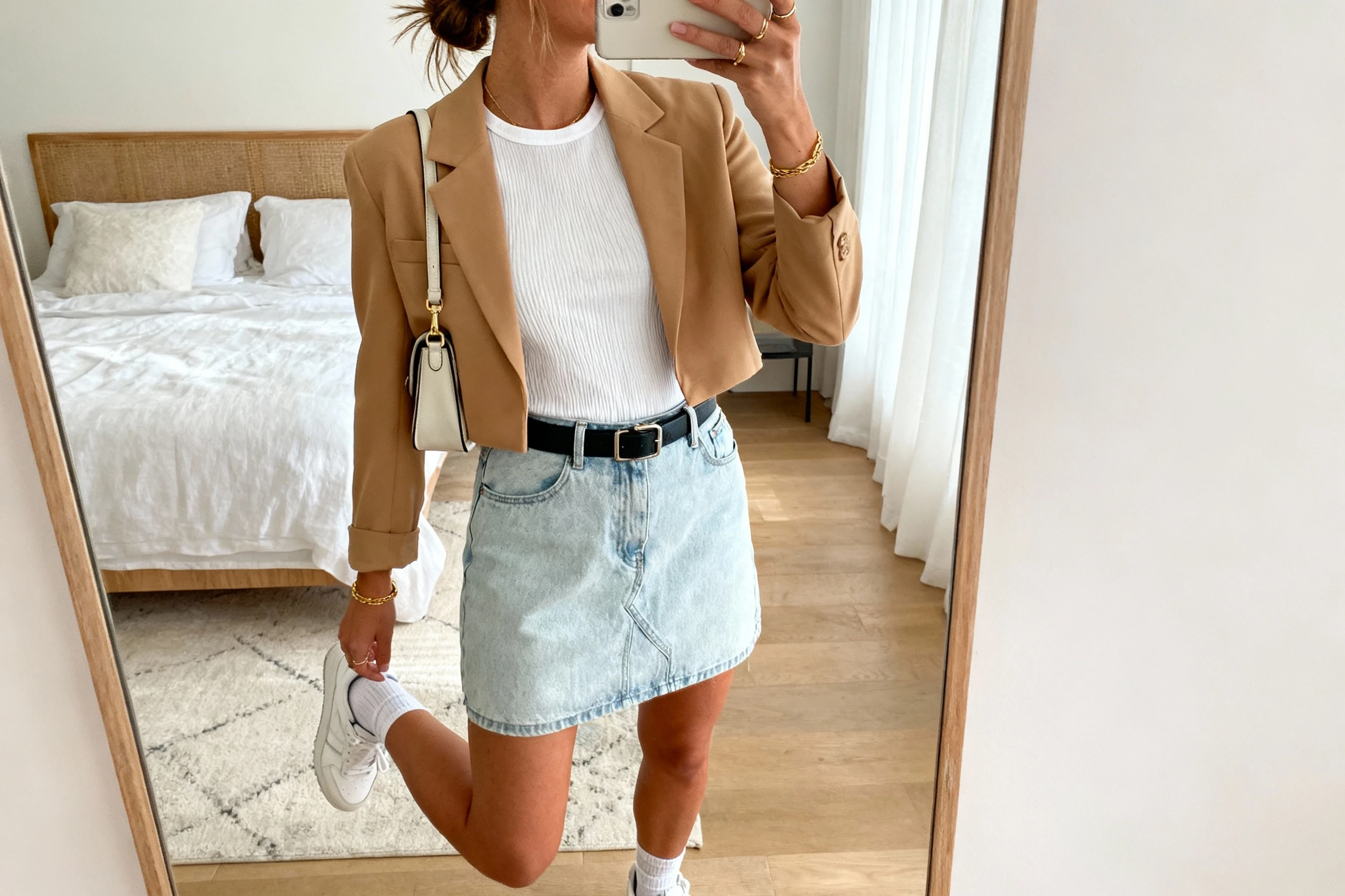 Want to look pulled together without going full corporate? A crisp button-up with a jeans mini is the sweet spot. It’s preppy, clean, and just a tiny bit cheeky in the best way.