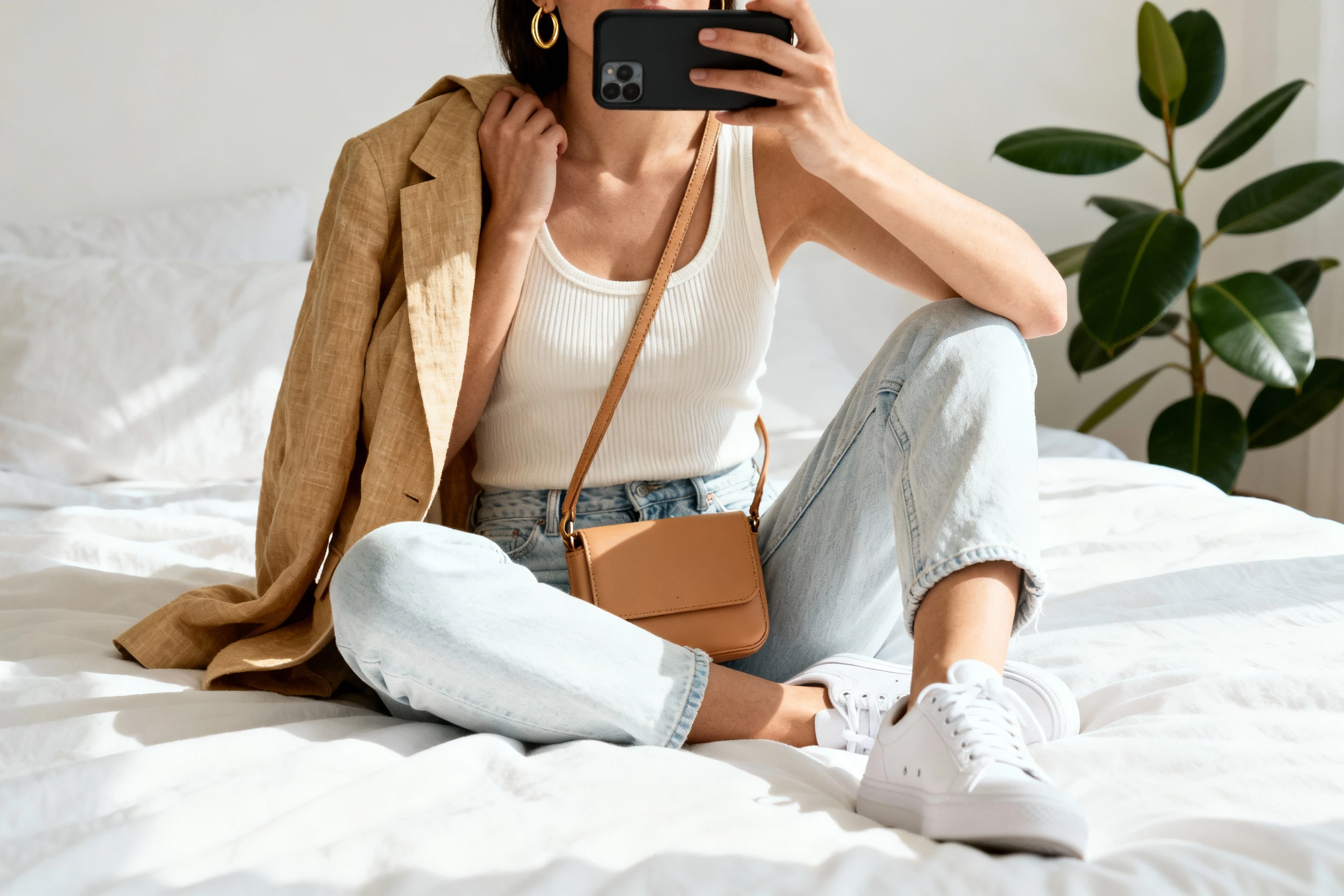 - Keep accessories warm-toned—tan leather and gold jewelry complement denim beautifully.