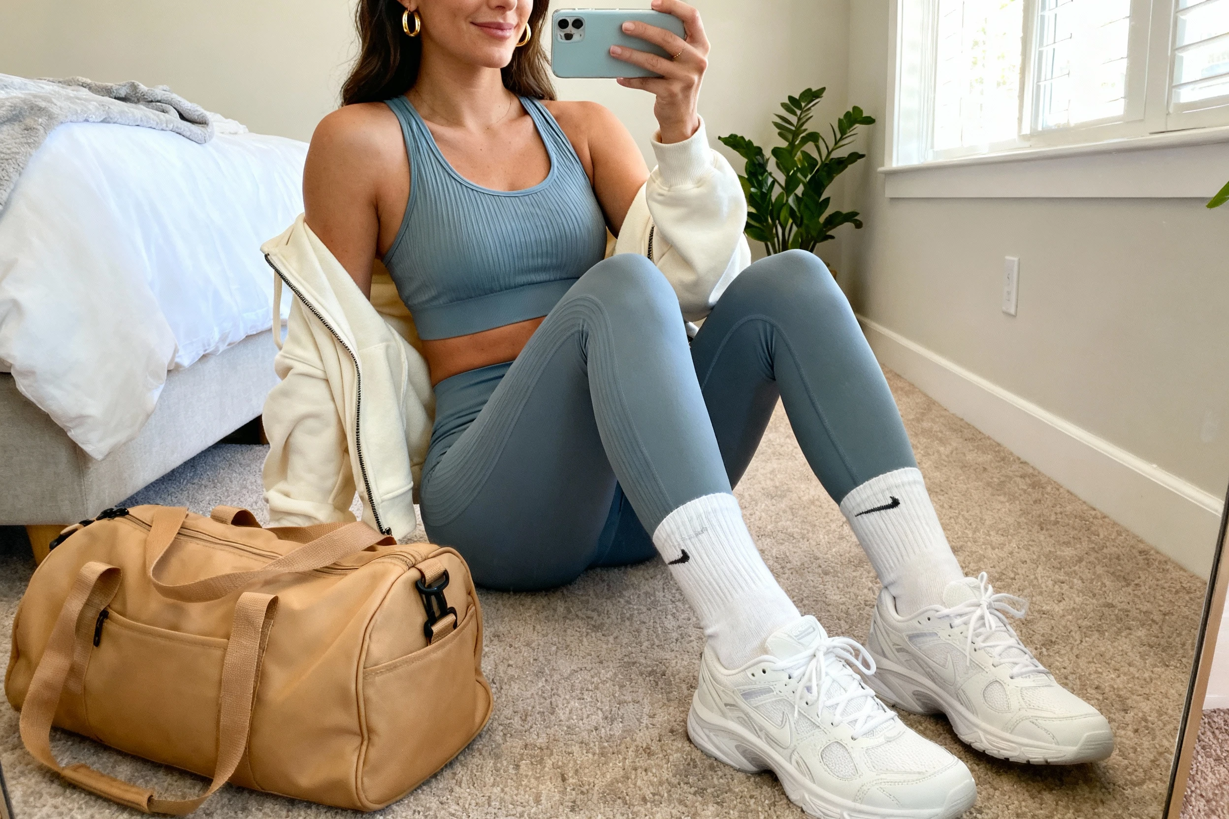 This is perfect for Pilates, mobility days, or any gym moment that calls for clean and calm. Want to soften it? Try a cream-on-cream version with tan sneakers for a chic, natural mood.